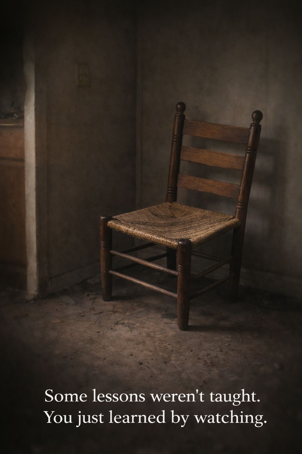 It looked harmless enough. Wooden legs worn smooth where hands had grabbed and dragged it. A woven seat that smelled faintly of old hay, spilled coffee, and something sour you couldn’t quite name. The kind of chair that pretended it belonged in a kitchen.